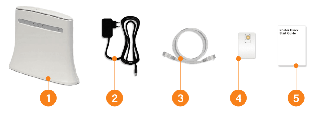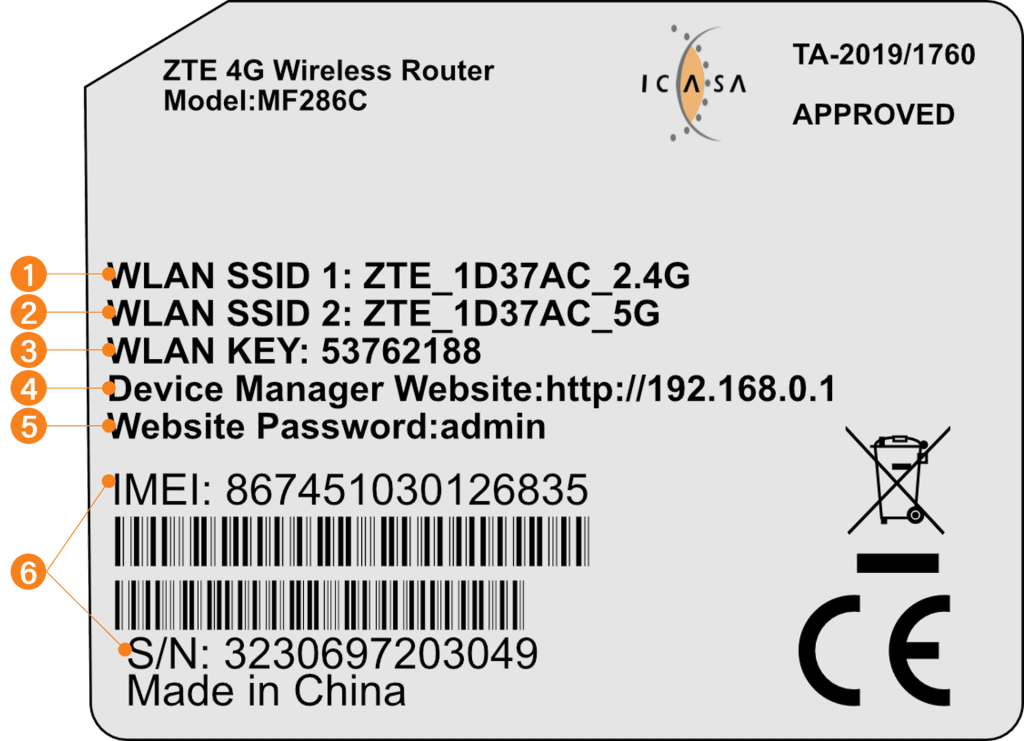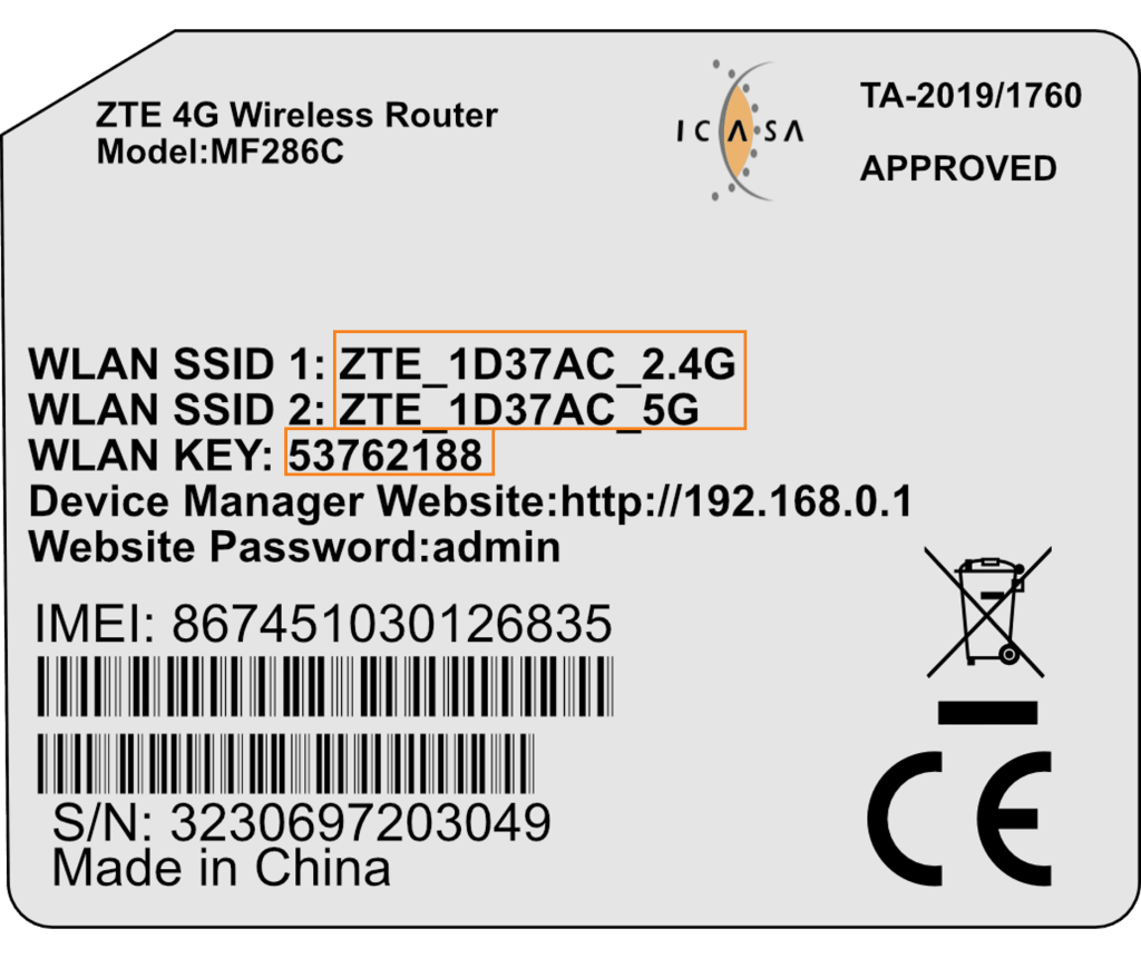 Underneath sticker: Shows WiFi name, WiFi password, admin login address, admin password, IMEI, and serial number. Take a quick photo of this for safekeeping.